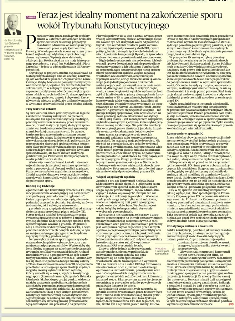 - Teraz jest idealny moment na zakończenie sporu wokół Trybunału Konstytucyjnego, Dziennik Gazeta Prawna 1 X 2024 r. Poniżej pełen tekst: